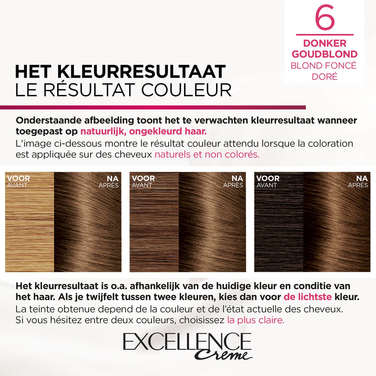 L'Oréal Paris Excellence Crème est une coloration permanente idéale pour couvrir les cheveux blancs. Cette coloration offre une couverture à 100% des cheveux blancs. Excellence Crème est une coloration triple soin. La crème colorante protège, le shampooing pH doux est doux pour le cuir chevelu et le nourrit, et le masque capillaire nourrit les cheveux. La crème colorante, enrichie en pro-kératine, aide à renforcer les cheveux. De plus, la coloration contient un sérum qui protège les cheveux pendant la coloration. Ainsi, la formule protège les cheveux pendant la coloration et offre une couleur longue durée. Le kit de coloration comprend également un shampooing pH. Celui-ci est doux pour le cuir chevelu. Vous utilisez le shampooing après la coloration pour rincer l'excès de la crème colorante des cheveux. Le shampooing révèle l'éclat des cheveux et les rend plus lisses. Cela contribue à une couleur riche et naturelle. Le masque capillaire Excellence Crème est la dernière étape du traitement colorant. Il a une formule légère enrichie en céramides qui nourrit intensément les cheveux sans les alourdir. Vous pouvez utiliser le masque capillaire plusieurs fois après la coloration pour maintenir les cheveux brillants, souples et pleins de vie.