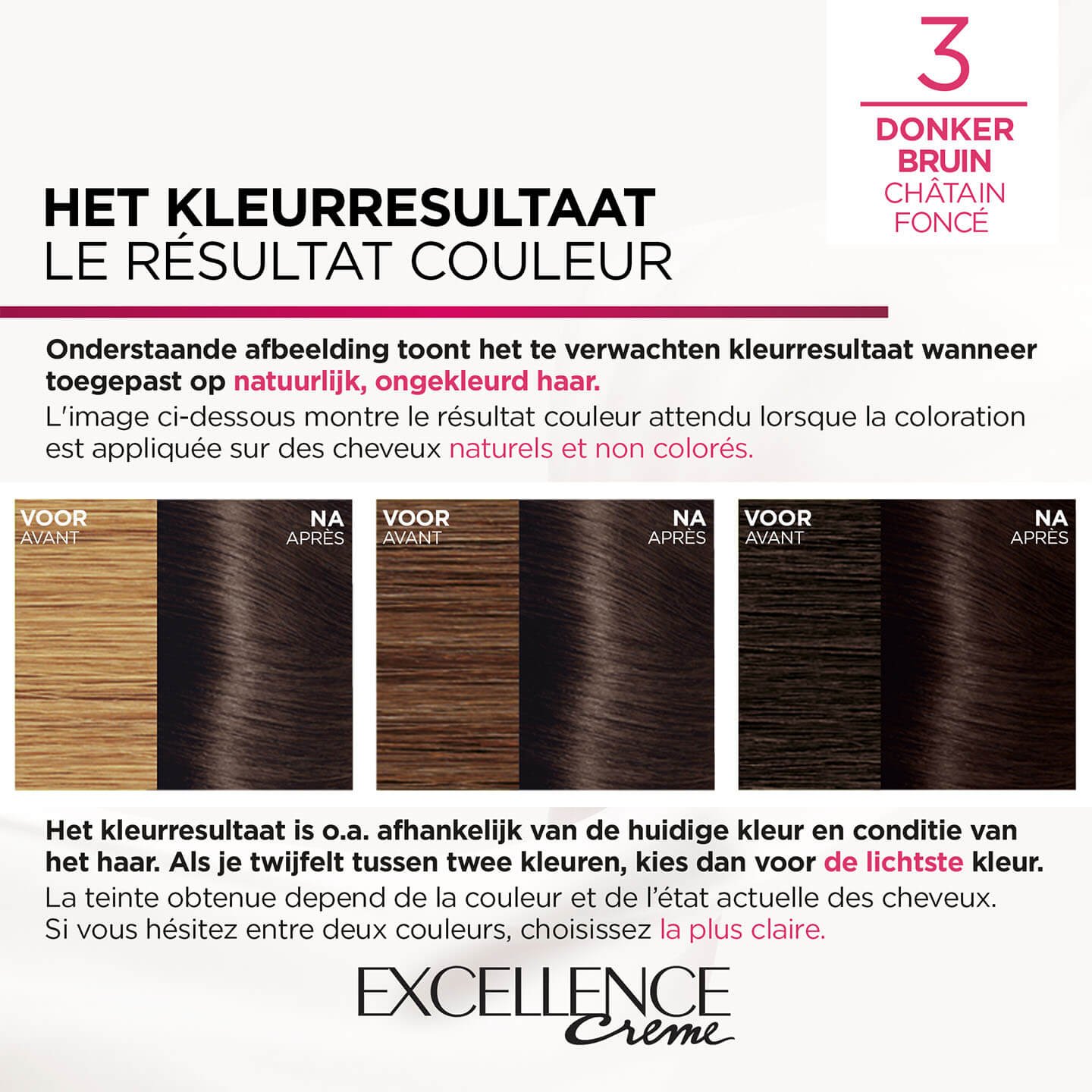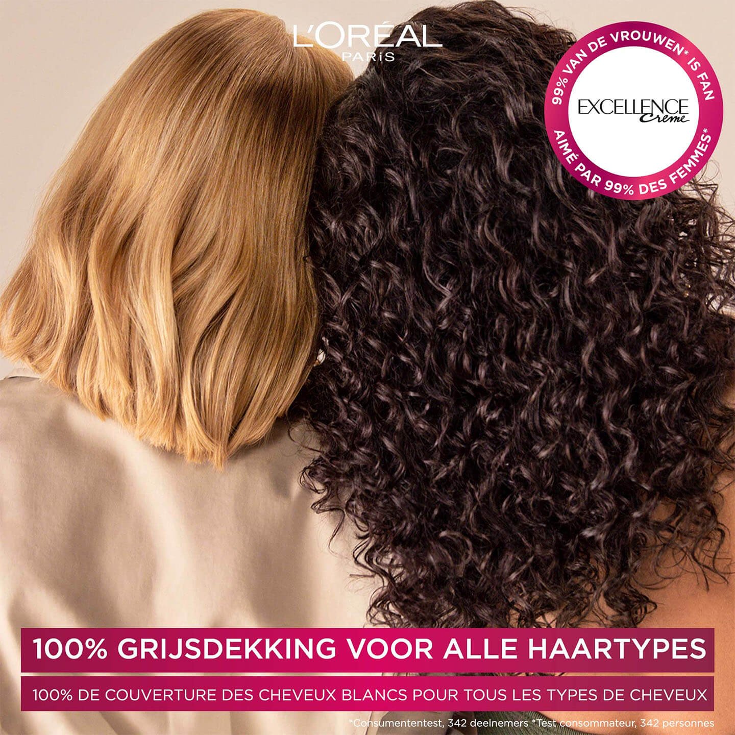L'Oréal Paris Excellence Crème est une coloration permanente idéale pour couvrir les cheveux blancs. Cette coloration offre une couverture à 100% des cheveux blancs. Excellence Crème est une coloration triple soin. La crème colorante protège, le shampooing pH doux est doux pour le cuir chevelu et le nourrit, et le masque capillaire nourrit les cheveux. La crème colorante, enrichie en pro-kératine, aide à renforcer les cheveux. De plus, la coloration contient un sérum qui protège les cheveux pendant la coloration. Ainsi, la formule protège les cheveux pendant la coloration et offre une couleur longue durée. Le kit de coloration comprend également un shampooing pH. Celui-ci est doux pour le cuir chevelu. Vous utilisez le shampooing après la coloration pour rincer l'excès de la crème colorante des cheveux. Le shampooing révèle l'éclat des cheveux et les rend plus lisses. Cela contribue à une couleur riche et naturelle. Le masque capillaire Excellence Crème est la dernière étape du traitement colorant. Il a une formule légère enrichie en céramides qui nourrit intensément les cheveux sans les alourdir. Vous pouvez utiliser le masque capillaire plusieurs fois après la coloration pour maintenir les cheveux brillants, souples et pleins de vie.