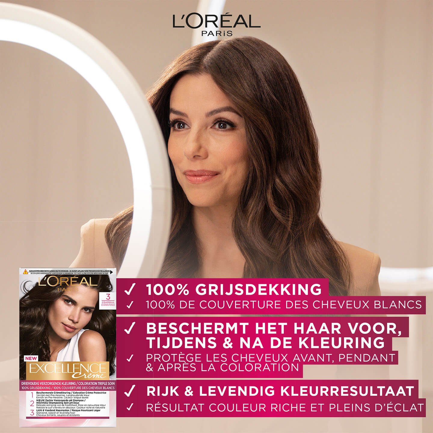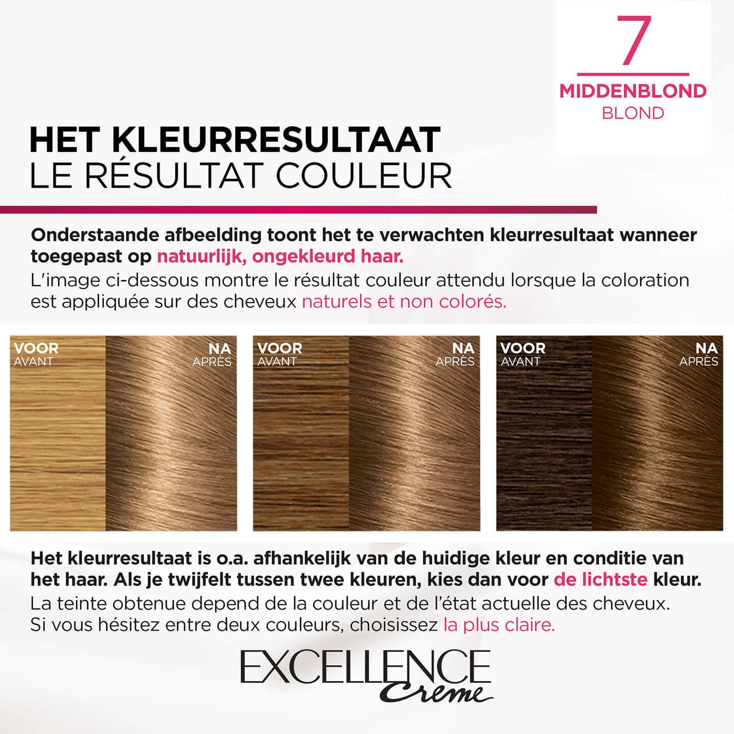 L'Oréal Paris Excellence Crème est une coloration permanente idéale pour couvrir les cheveux blancs. Cette coloration offre une couverture à 100% des cheveux blancs. Excellence Crème est une coloration triple soin. La crème colorante protège, le shampooing pH doux est doux pour le cuir chevelu et le nourrit, et le masque capillaire nourrit les cheveux. La crème colorante, enrichie en pro-kératine, aide à renforcer les cheveux. De plus, la coloration contient un sérum qui protège les cheveux pendant la coloration. Ainsi, la formule protège les cheveux pendant la coloration et offre une couleur longue durée. Le kit de coloration comprend également un shampooing pH. Celui-ci est doux pour le cuir chevelu. Vous utilisez le shampooing après la coloration pour rincer l'excès de la crème colorante des cheveux. Le shampooing révèle l'éclat des cheveux et les rend plus lisses. Cela contribue à une couleur riche et naturelle. Le masque capillaire Excellence Crème est la dernière étape du traitement colorant. Il a une formule légère enrichie en céramides qui nourrit intensément les cheveux sans les alourdir. Vous pouvez utiliser le masque capillaire plusieurs fois après la coloration pour maintenir les cheveux brillants, souples et pleins de vie.
