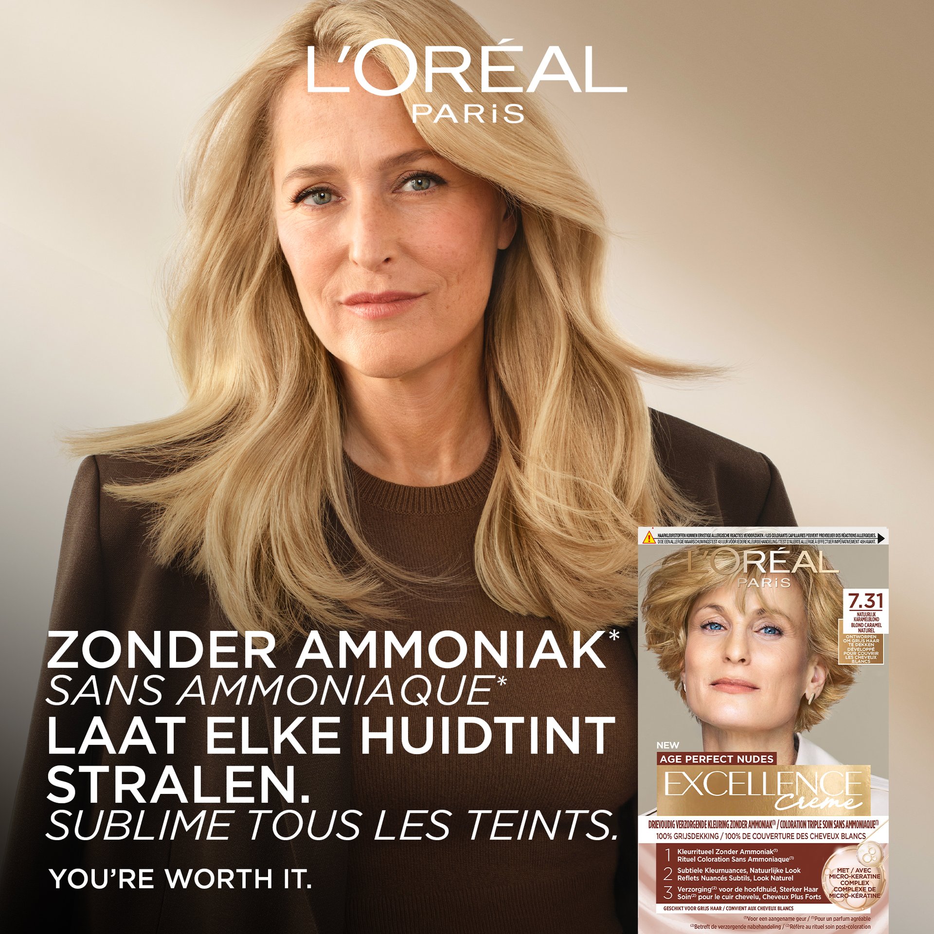 En vieillissant, nos cheveux et notre cuir chevelu changent. Nous constatons un pourcentage plus élevé de cheveux blancs, notre cuir chevelu peut devenir plus sensible et notre fibre capillaire peut sembler plus fragile. Excellence Crème Age Perfect Nudes de L'Oréal Paris est spécifiquement conçue pour relever ces défis. Sa formule sans ammoniac est douce pour le cuir chevelu, elle est enrichie en micro-kératine pour rendre les cheveux plus forts et plus épais, et sa technologie à couches de tons crée une couleur d'apparence naturelle qui se marie parfaitement avec les gris, ce qui rend la repousse des racines moins visible.