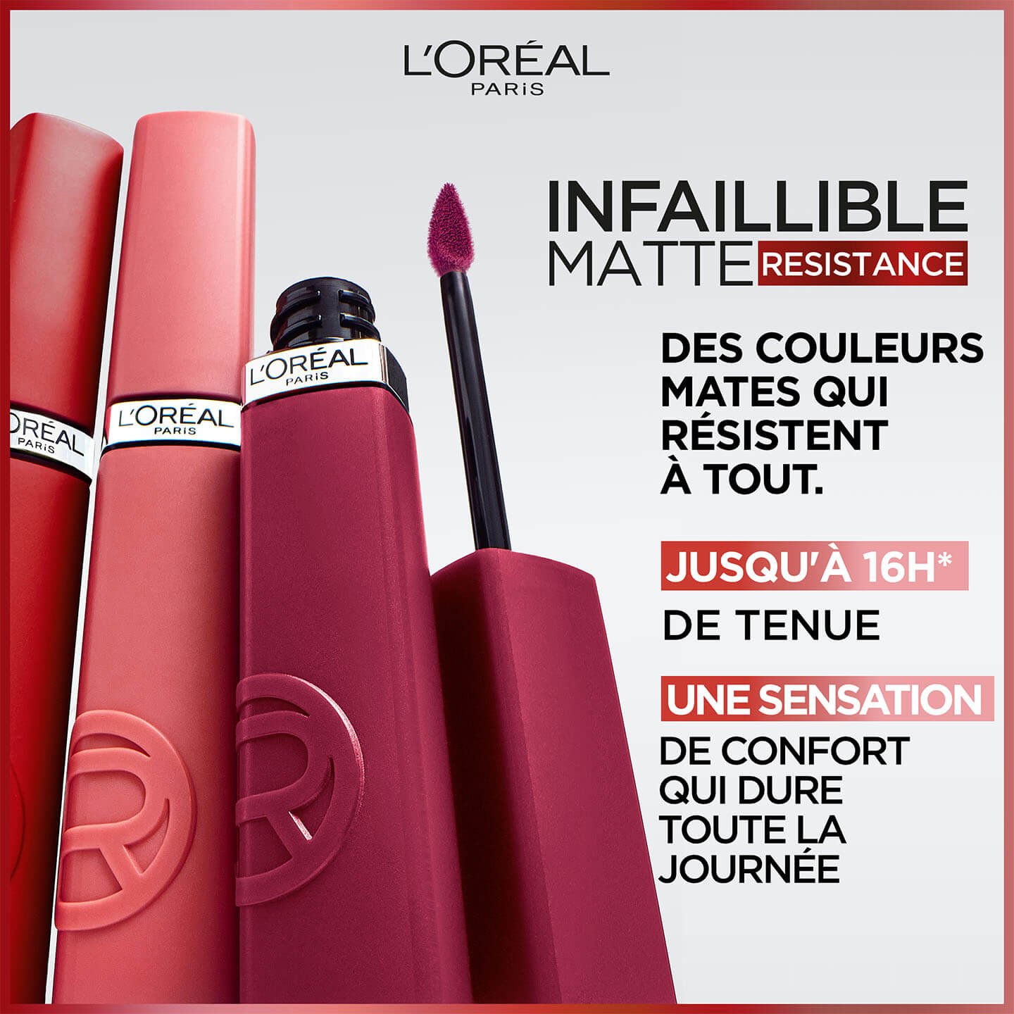 L’Oréal Paris Infaillible Matte Resistance est un rouge à lèvres avec une longue tenue jusqu’à 16 heures*. Grâce à ce rouge à lèvres, vos lèvres profitent d’une magnifique couleur mate, sans devoir se soucier de sa tenue ! Ce rouge à lèvres est sans transfert, ne s’estompe pas et est kiss-proof et waterproof. En outre, ce rouge à lèvres est confortable sur les lèvres, car il a une structure ultrafine et est enrichi en acide hyaluronique. Grâce à cette formule, il n’assèche pas les lèvres. L’applicateur pratique de ce rouge à lèvres vous permet de dessiner de manière précise les contours de vos lèvres. Ce rouge à lèvres liquide apporte beaucoup de couleur dès son application, et ne file pas dans les fines lignes des lèvres.