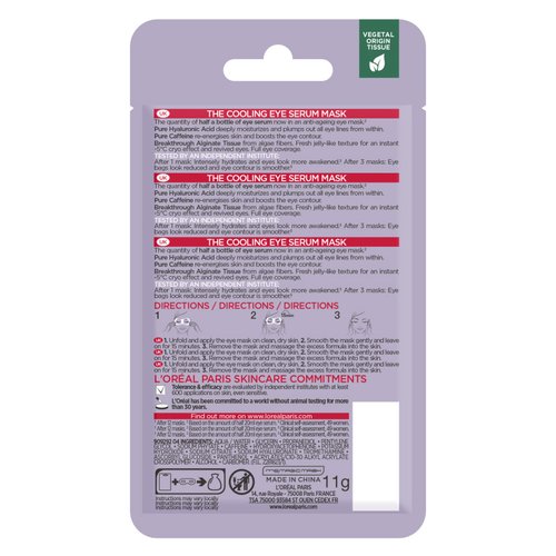 TISSU ALGINATE INNOVANT issu de fibres d'algues. Texture gélifiée fraîche pour un effet rafraîchissant immédiat de -5C et un look revitalisé. Couvre entièrement le contour des yeux.