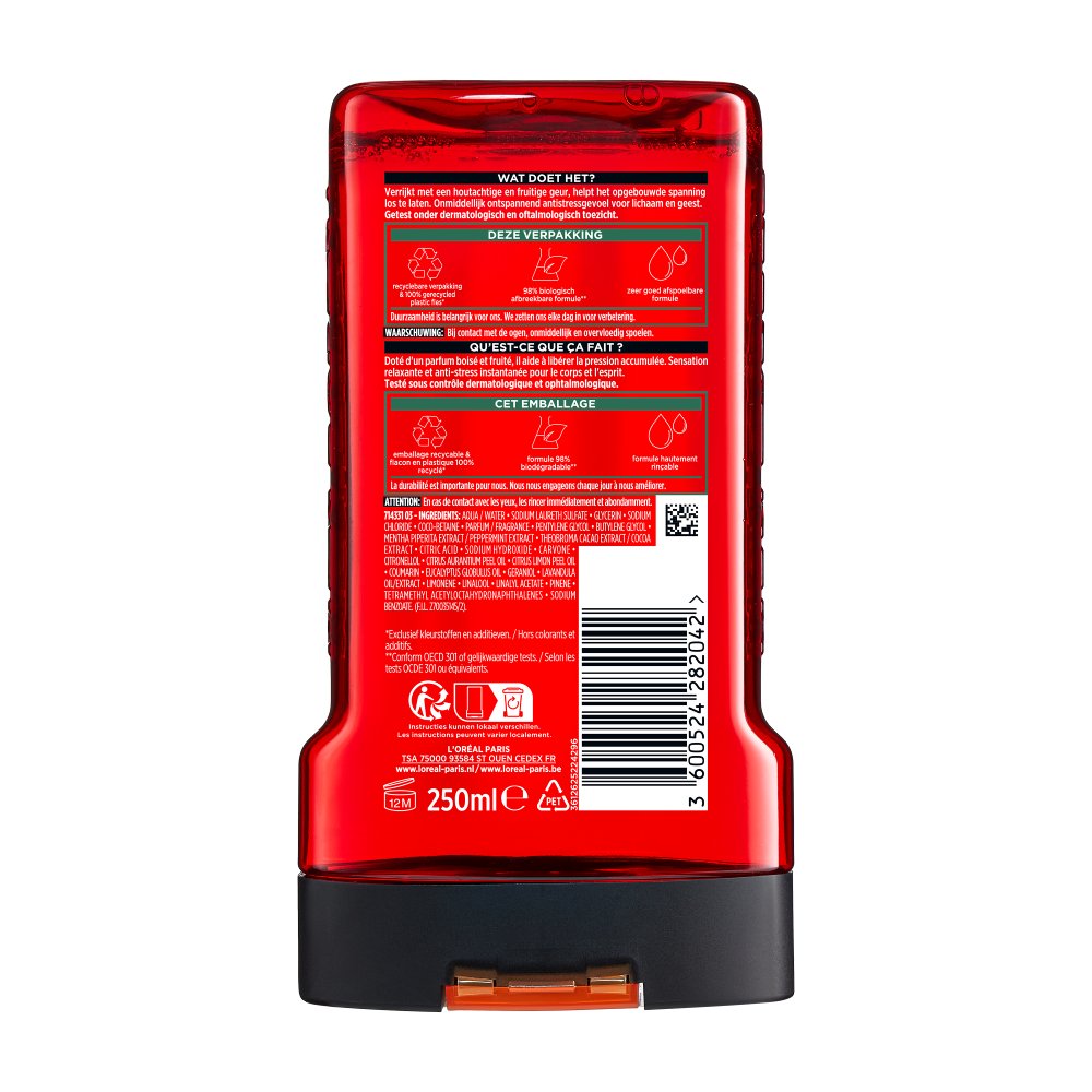 714331 03 - INGREDIENTS: AQUA / WATER • SODIUM LAURETH SULFATE • GLYCERIN • SODIUM CHLORIDE • COCO-BETAINE • PARFUM / FRAGRANCE • PENTYLENE GLYCOL • BUTYLENE GLYCOL • MENTHA PIPERITA EXTRACT / PEPPERMINT EXTRACT • THEOBROMA CACAO EXTRACT / COCOA EXTRACT • CITRIC ACID • SODIUM HYDROXIDE • CARVONE • CITRONELLOL • CITRUS AURANTIUM PEEL OIL • CITRUS LIMON PEEL OIL • COUMARIN • EUCALYPTUS GLOBULUS OIL • GERANIOL • LAVANDULA OIL/EXTRACT • LIMONENE • LINALOOL • LINALYL ACETATE • PINENE • TETRAMETHYL ACETYLOCTAHYDRONAPHTHALENES • SODIUM BENZOATE (F.I.L. Z70035145/2).
