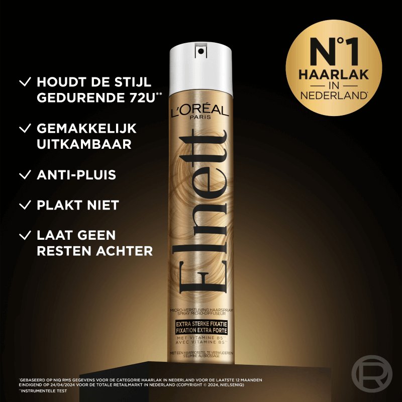 De Elnett Satin Extra Sterke Fixatie haarlak van L'Oréal Paris biedt een langdurige fixatie en geeft een zijdezacht gevoel. De haarlak geeft een langdurige fixatie en maakt het zijdezacht, laat het haar maar plakt niet. Elnett Satin is al generaties lang dé styling spray voor toonaangevende hair-artists. De haarspray laat zich gemakkelijk verwijderen door te borstelen. Elnett Satin is al sinds 1960 de gouden standaard.