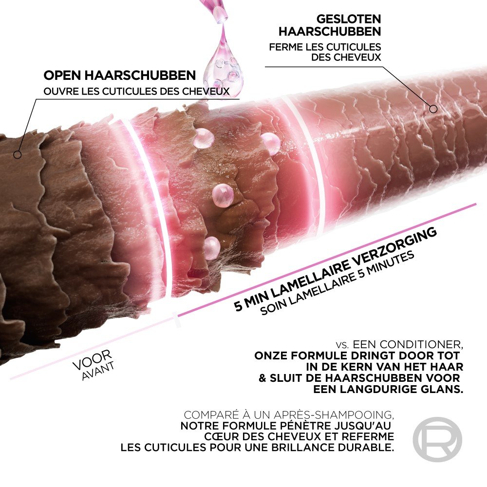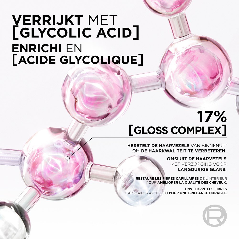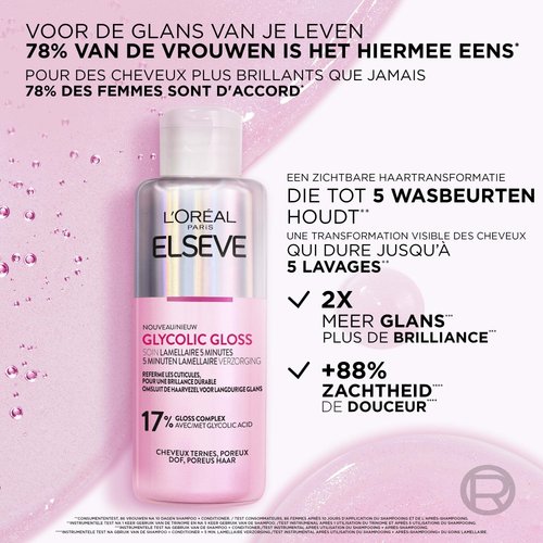 De L’Oréal Paris Elvive Glycolic Gloss 5 Minuten Lamellaire Verzorging herstelt de haarschubben om het haar glad te maken met prachtige glans. Glanzend haar is gezond haar, omdat het gladde oppervlak perfect licht reflecteert. Echter, haarbeschadiging verstoort de haarschubben, waardoor vezels ruw, poreus en dof worden - hierdoor is je haar niet in staat om licht te weerkaatsen. De glansformule is verrijkt met glycolzuur dat de haarschubben verzegelt om het haar op te vullen en glad te maken. Met deze Glycolic Gloss 5 Minuten Lamellaire Verzorging krijg je tot 2x meer glans¹ en 88% meer zachtheid². Voor de glans van je leven!