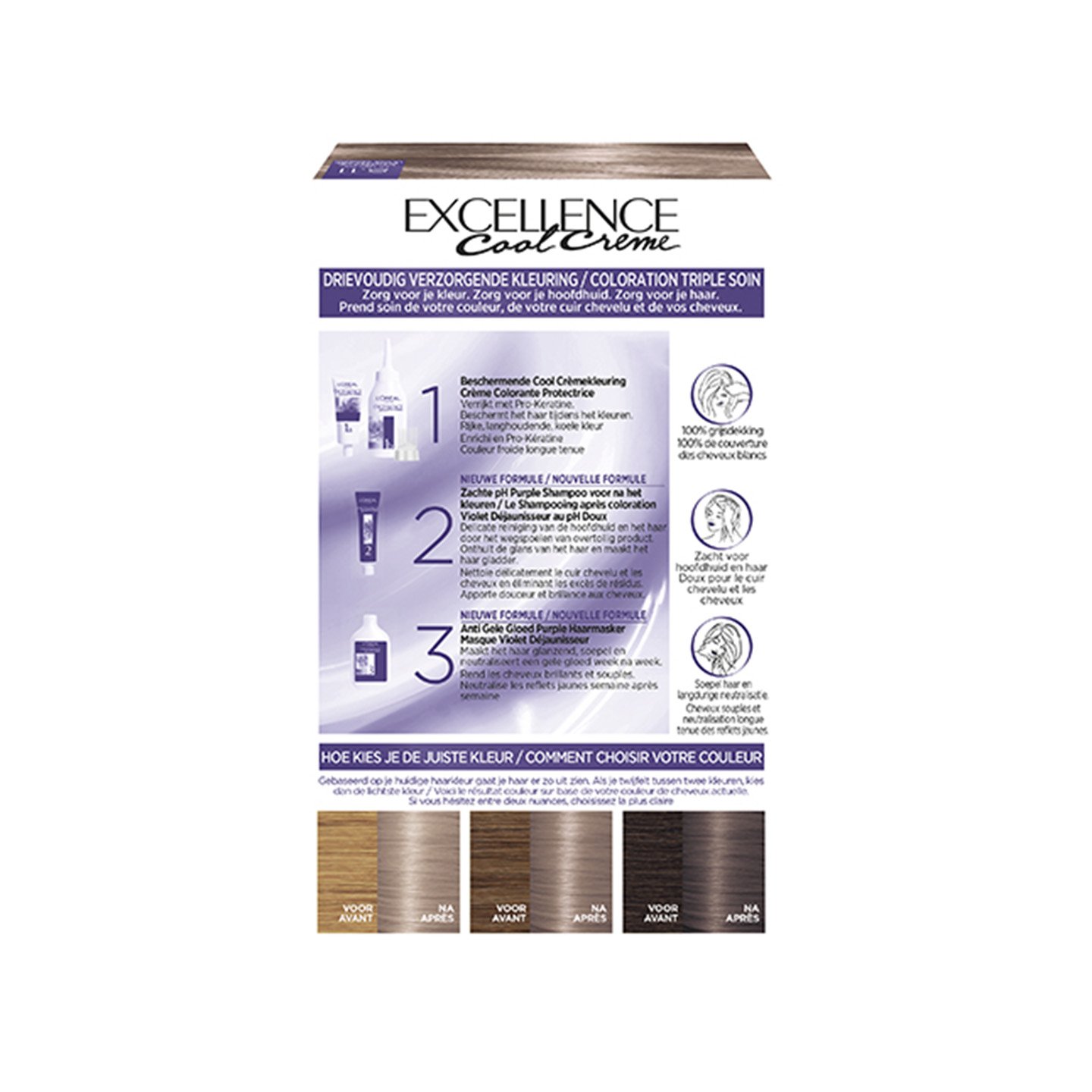 L’Oréal Paris Excellence Cool Crème is een permanente haarkleuring die ideaal is voor het dekken van grijs haar. De haarkleuring biedt tot 100% grijsdekking en een koel kleurresultaat. Wil jij je haar verven in een koele kleur? De crèmekleuring beschermt, de pH purple shampoo is zacht voor de hoofdhuid en verzorgt en het haarmasker voedt en beschermt het haar tegen gele en oranje ondertonen. De crèmekleuring, verrijkt met pro-keratine, helpt bij het versterken van het haar. De formule zorgt daarnaast voor bescherming van het haar tijdens het kleuren en een rijke, langhoudende koele kleur. Bij de kleuring zit een pH purple shampoo. Deze is zacht voor de hoofdhuid. Je gebruikt de shampoo na het kleuren om overtollige crèmekleuring uit het haar te spoelen. De shampoo onthult de glans van het haar en maakt het gladder. Het anti gele gloed haarmasker is de laatste stap van de kleurbehandeling. In het haarmasker zitten paarse pigmenten die de gele en oranje ondertonen in het haar neutraliseren, zodat je de gewenste koele haarkleur behoudt. Je kunt het haarmasker na het kleuren meerdere malen gebruiken. Zo blijft het haar glanzend en soepel en het kleurresultaat langer koel.