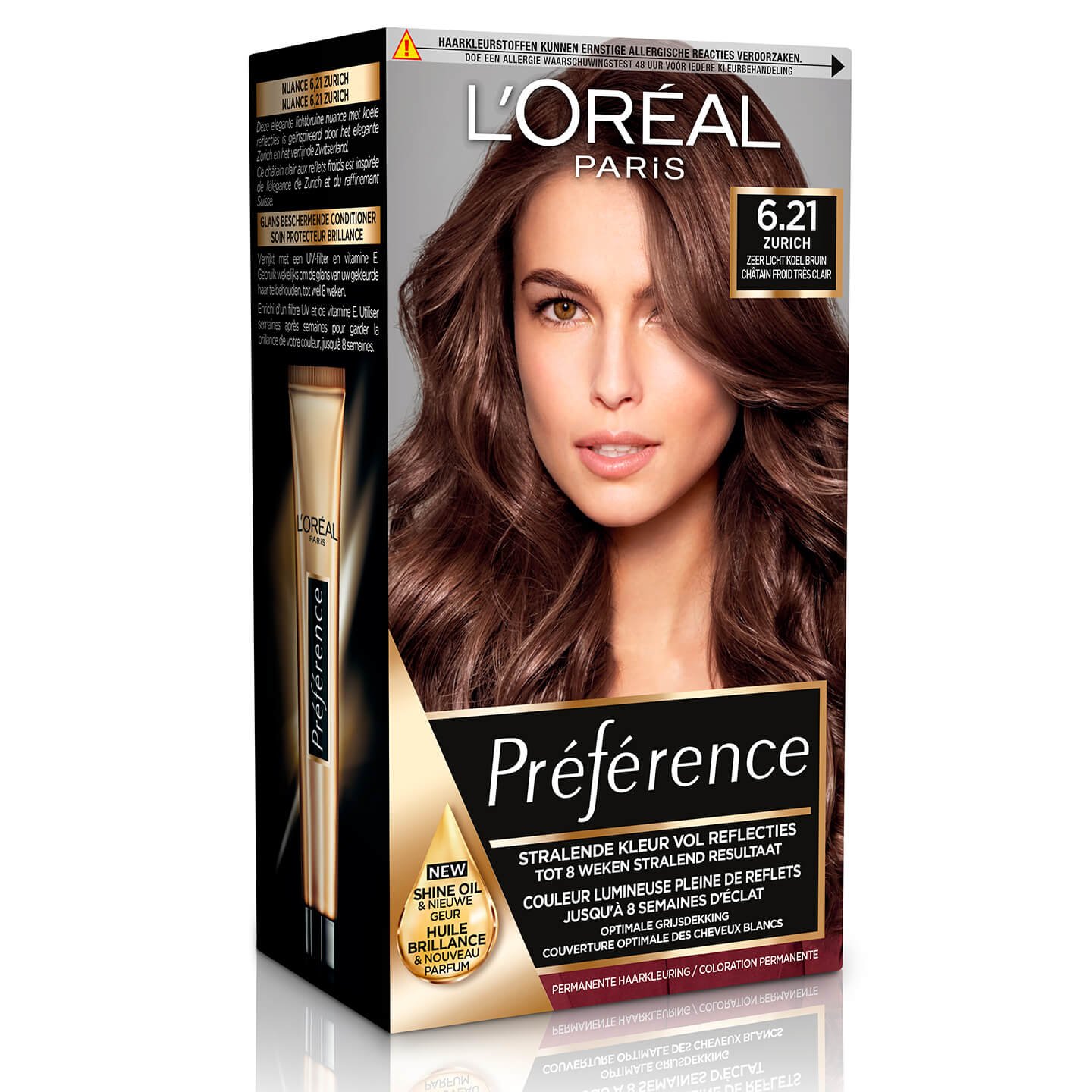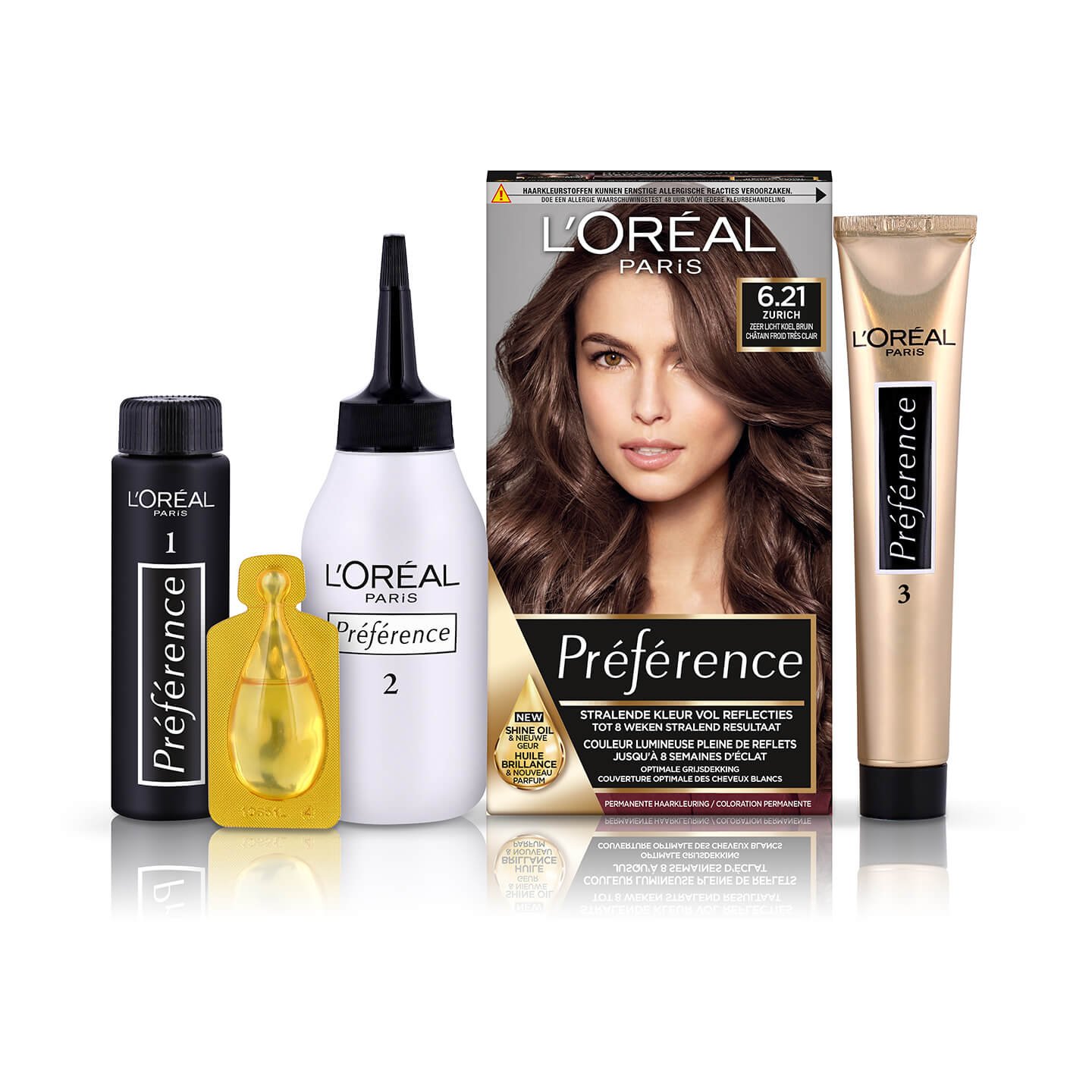 L'Oréal Paris Préférence haarkleuring is een permanente haarverf die zorgt voor een natuurlijk kleurresultaat. De haarverf past zich aan aan de natuurlijke nuances van het haar waardoor de reflecties in de haarkleur behouden blijven. De haarverf dekt grijs haar optimaal. De formule is verrijkt met een bloemengeur voor een aangename ervaring tijdens het kleuren.