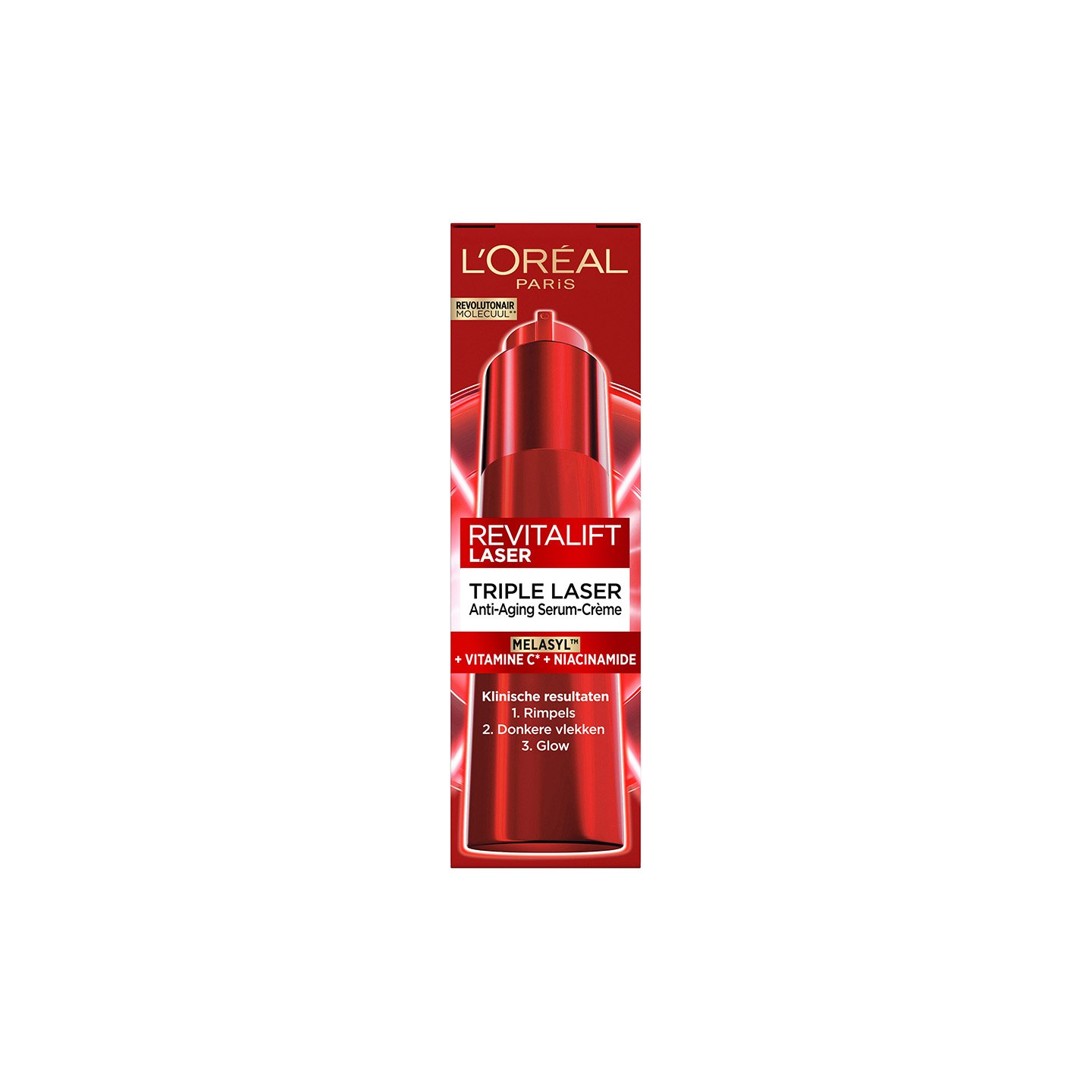 Voor een krachtige anti-aging routine begin je met Revitalift Laser Melasyl Creamy-Serum om rimpels, pigmentvlekken en een doffe huid aan te pakken. Breng daarna 's ochtends Revitalift Laser Triple Action SPF 25 Dagcrème aan om je huid te beschermen en het ontstaan van nieuwe pigmentvlekken te helpen voorkomen.